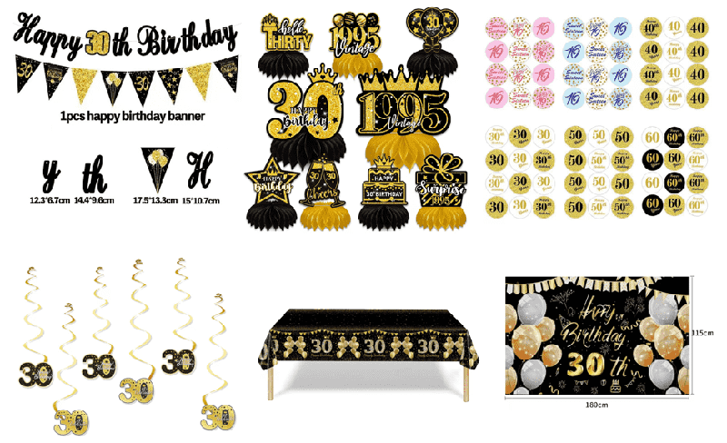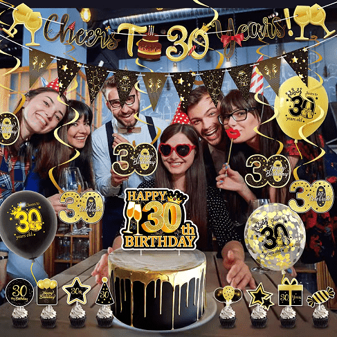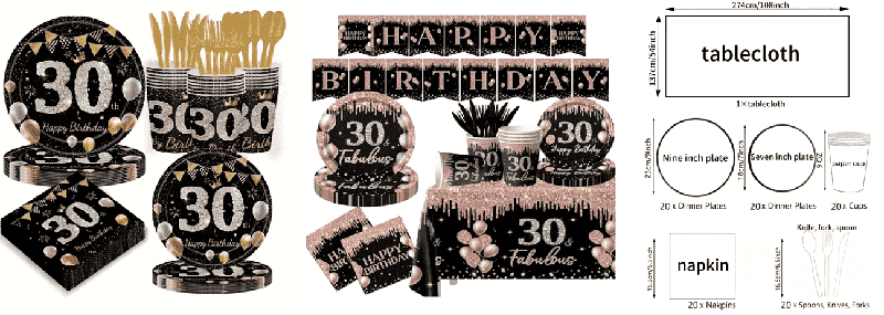 Kertu ulang tahun kertas minangka inti dekorasi kue: Kertu utama adhedhasar tembung kayata "Sugeng ulang taun" ulang taun "lan cocog karo bentuk cangkir sampanye. Ukuran kasebut gedhe lan cocog kanggo dekorasi kue utama. Ana uga logo "30" 30, makutha lan kertu cilik liyane, cocog kanggo cupcakes, digawe saka karton hard, kanthi kayu pring ing ngisor, sing bisa digunakake kanggo nggunakake.