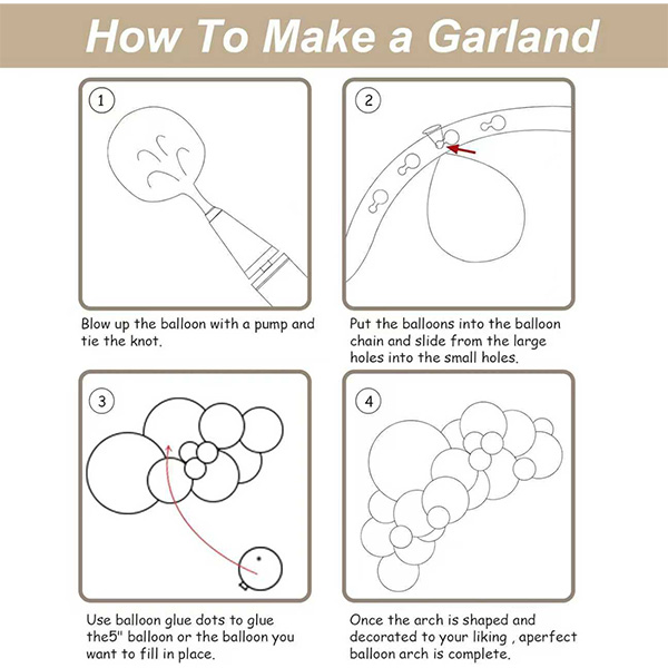 Manungsa waé & Pènget:Mangga AJA ngisi balon lan uga supaya sunburn, overheat, obyek runcing lan gesekan gedhe banget. Ngontrol jumlah udhara sing dikembangake menyang saben balon kanggo entuk ukuran balon sing cocog, nikmati pesta kit Balon Garland Arch.
