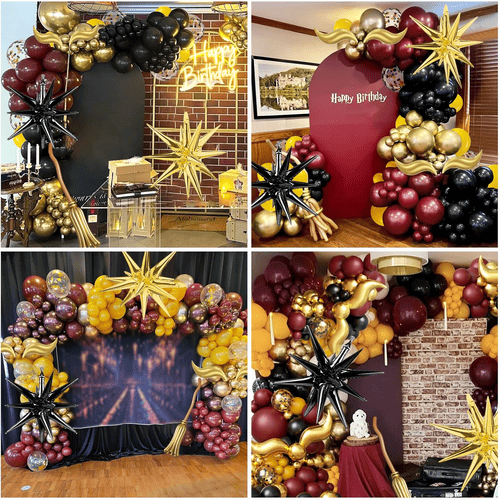 Balon lateks ing lengkungan balon bertema Harry Potter digawe saka 100% lateks mentah sing diimpor saka Asia Tenggara. Amarga bahan alami, kabeh ramah lingkungan lan ora mbebayani kanggo bocah lan wong diwasa. Werna warna-warna simbolis saka film Harry Potter, kalebu anggur abang, kuning, ireng lan emas. Kanggo nambah lapisan liyane, kita uga wis nambah balon confetti, confetti emas metalik.