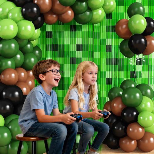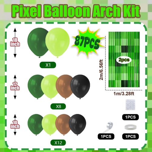 Kit lengkungan balon minecraft ulang tahun iki ditutupi ijo peteng matte, ijo apel matte, ireng matte lan coklat matte. Wis balon 10inch, 12inch balon lan 18inch balon.