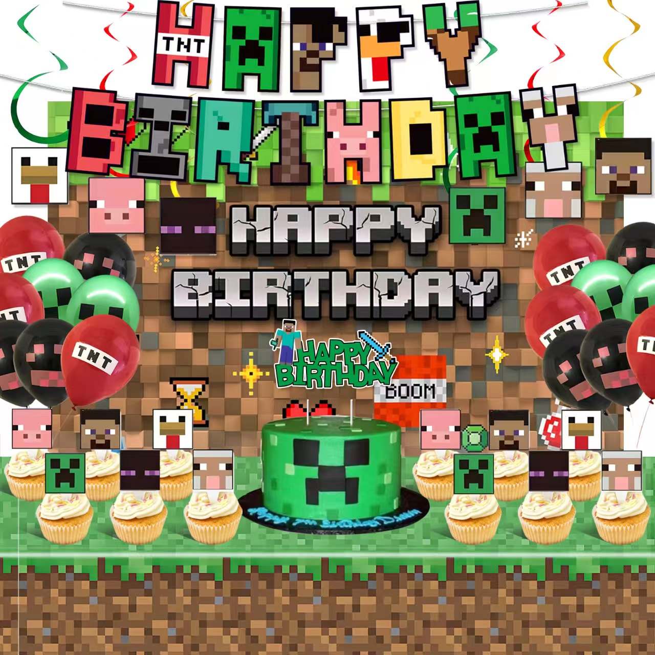 Barang sing bisa cocog karo tema. Tabel meja Minecraft bisa uga nganggo tableware gaya sing padha. Minecraft tableCraft bisa mbukak latar mburi gaya sing padha. Minecraft table bisa mbukak nganggo gaya banner sing padha. Setel kasebut bisa nambah balon latek ijo. Setel kasebut bisa nambah balon latek coklat. Setel kasebut bisa nambah balon foil piksel. Partai kasebut katon kaya blok blok.