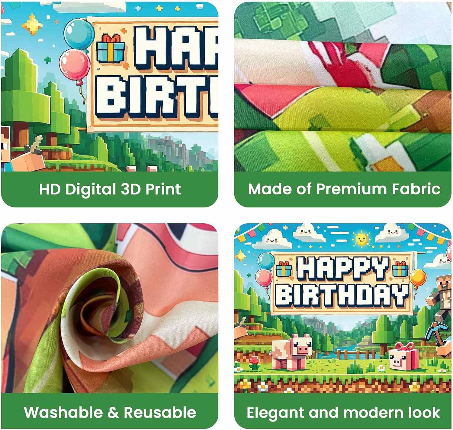 Spanduk kertas Minecraft njupuk ulang tahun sing seneng karo ide utama. Huruf lan bagean cilik duwe tampilan piksel sing kuwat. Sawetara huruf digawe saka bentuk Steve, creeper, Enderman. Sawetara huruf duwe tnt, inten, pitik. Saben bagean cilik nuduhake gaya game ing Minecraft. Sawise gantung, spanduk nuduhake tema pesta cepet. Iki menehi ruang ulang taun sing cerah.