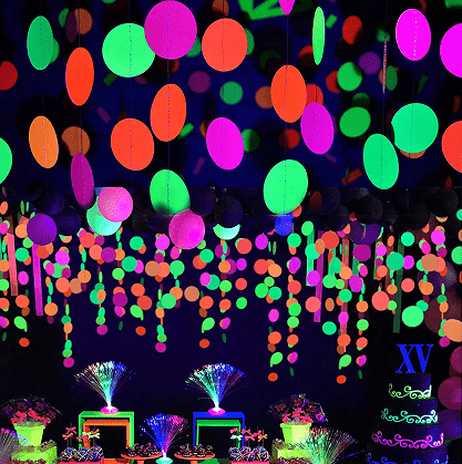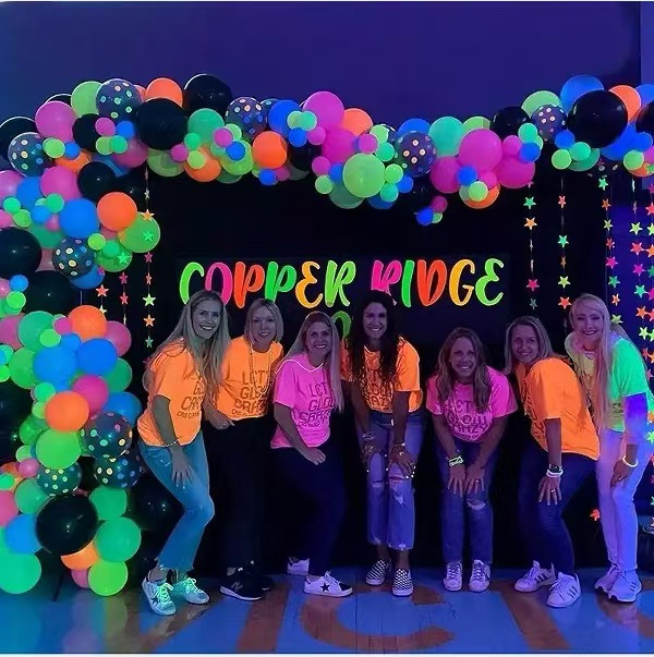 Beda saka dekorasi balon biasa, setelan kasebut nduweni ciri respon fluoresensi cahya ireng, lan bisa mujudake efek emisi cahya neon sing ekstrem nalika digunakake karo lampu cahya ungu, sing bisa nyukupi kabutuhan aktivitas ing wayah wengi kayata pesta musik listrik, Halloween, pesta Taun Anyar, bar tema bengi, lan liya-liyane. efisiensi turnover barang.