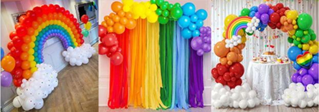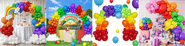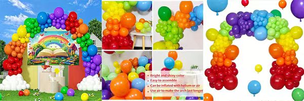 Balon berwarna Pelangi utamane abang, oranye, kuning, ijo, pirus, lan biru. Werna sing cerah lan serbaguna iki bakal urip ing papan sing kurang.