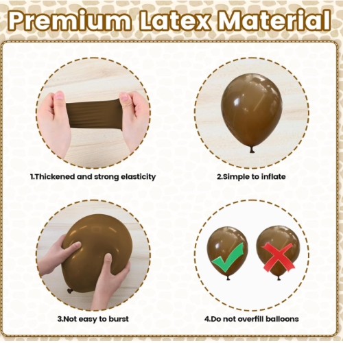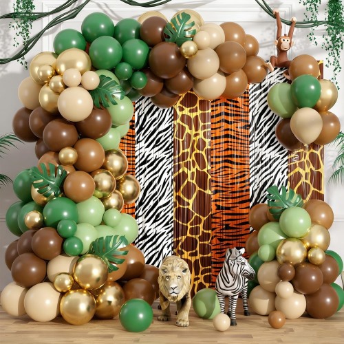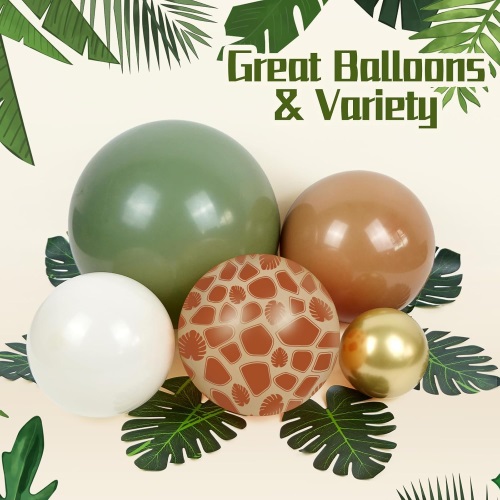 Ana luwih saka 100pcs balon lateks saben Safari balon arch. Iku kalebu 5inch, 10inch lan 18inch balon lateks ijo peteng, 5inch, 10inch lan 18inch avocado balon lateks ijo, 5inch, 10inch lan 18inch balon lateks coklat, 10inch sand white lateks balon, 10inch kacang ijo, 10inch teh lateks balon 10inch, 10inch teh lateks chrome balon lateks confetti, balon printing jerapah 12inch, balon printing macan 12inch lan aksesoris balon.