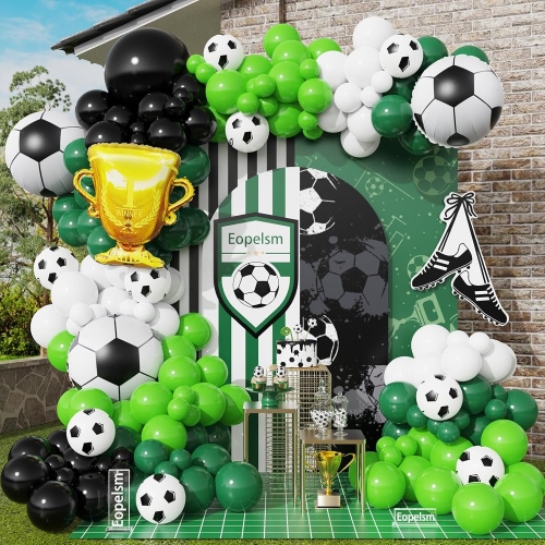 Set garland balon bal-balan kita duwe macem-macem desain, kalebu koleksi ireng lan putih. Dheweke makili warna bal-balan klasik, luwih ditekanake karo balon foil bal-balan, dirancang kanthi ati-ati supaya meh padha karo bal-balan nyata ing wangun lan rinci. Dheweke nambah tema. Kita uga nawakake kombinasi seri ijo, putih lan ireng. Ijo nglambangake gambut sing subur, ing ngendi bal-balan kanthi bungah muter ing lapangan ijo zamrud. Dheweke nggawe atmosfer stadion sing sregep, immersive lan asli.
