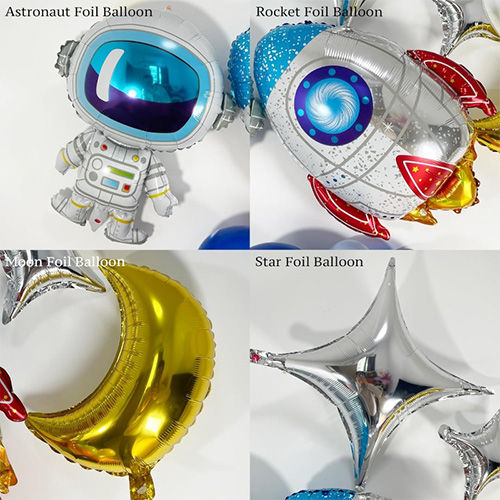 Garland balon angkasa iki biasane ngemot macem-macem ukuran balon lateks, balon foil, tali pancing, pita lan aksesoris liyane, isi tartamtu tundhuk setelan paket sing beda.