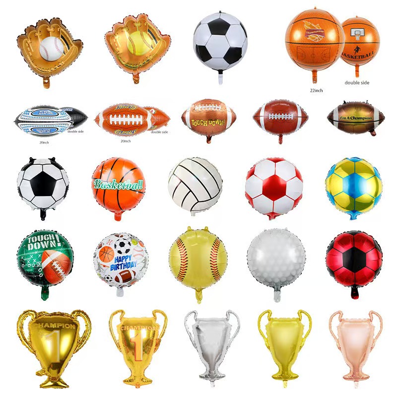 Desain nyakup pemodelan peralatan olahraga, basket, bal-balan, dumbbells, trofi, tokoh olahraga, "menang", "Juara" lan huruf insentif liyane. Ukuran gedhe (18-36 inci) ora perlu komplen, lan bisa dadi fokus visual nalika digantung ing tengah utawa mlebu kegiatan kasebut. Apike banget kanggo adegan kayata acara skala gedhe, kegiatan olahraga ruangan lan game olahraga kampus, cepet-cepet olahraga saka pemandangan.