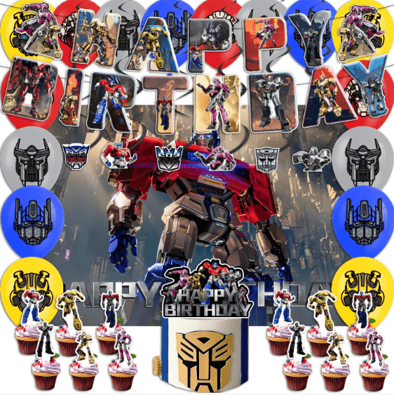 Kombinasi klasik: Balon foil Transformers kanthi gendera tema balon lateks warna, balon lateks minangka dhasar, balon foil minangka inti visual, bendera minangka dekorasi tema, cocok kanggo pesta ulang tahun, perayaan festival tata letak dhasar.