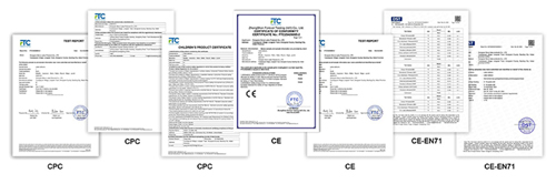 Produk lengkap kita wis lulus CPC, CE, EN71 lan sertifikasi wewenang liyane, kanthi tundhuk banget karo peraturan safety pasar Eropa lan Amerika lan target pasar liyane. Kualifikasi kasebut bisa mbantu barang sampeyan mbusak bea cukai kanthi lancar lan ngindhari risiko kepatuhan ing pasar luar negeri.